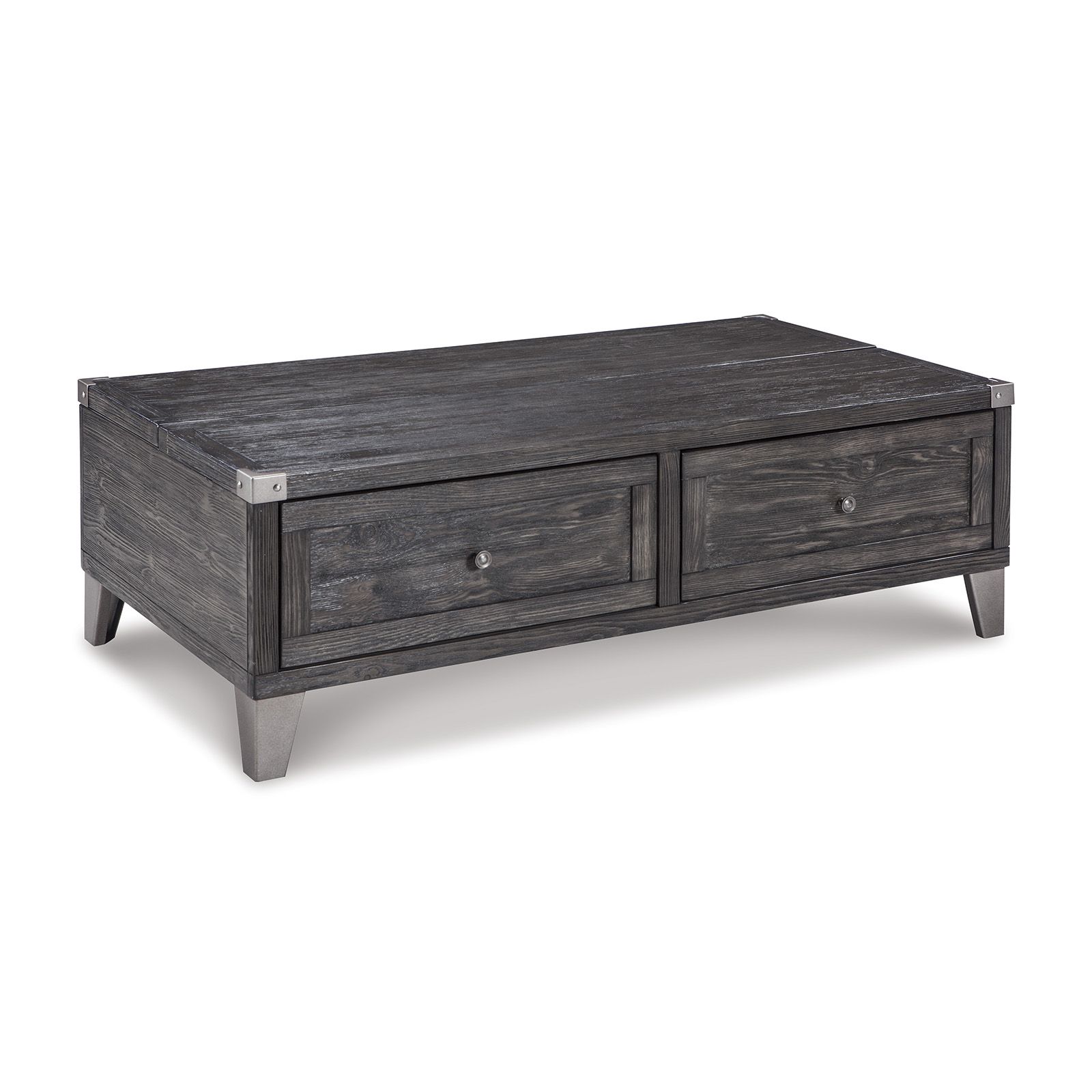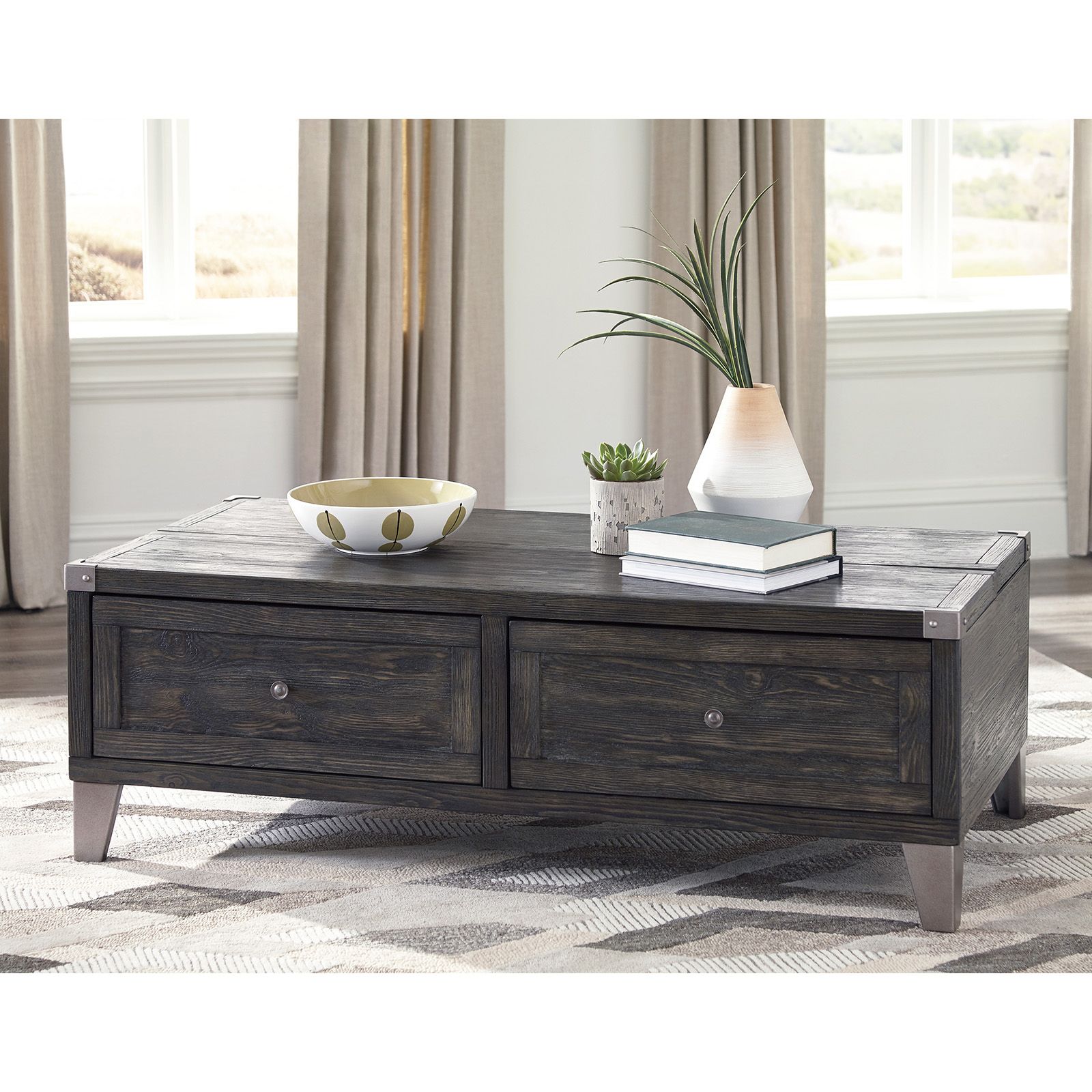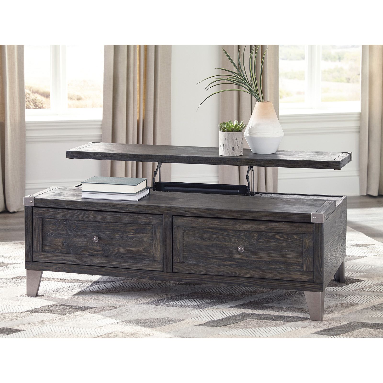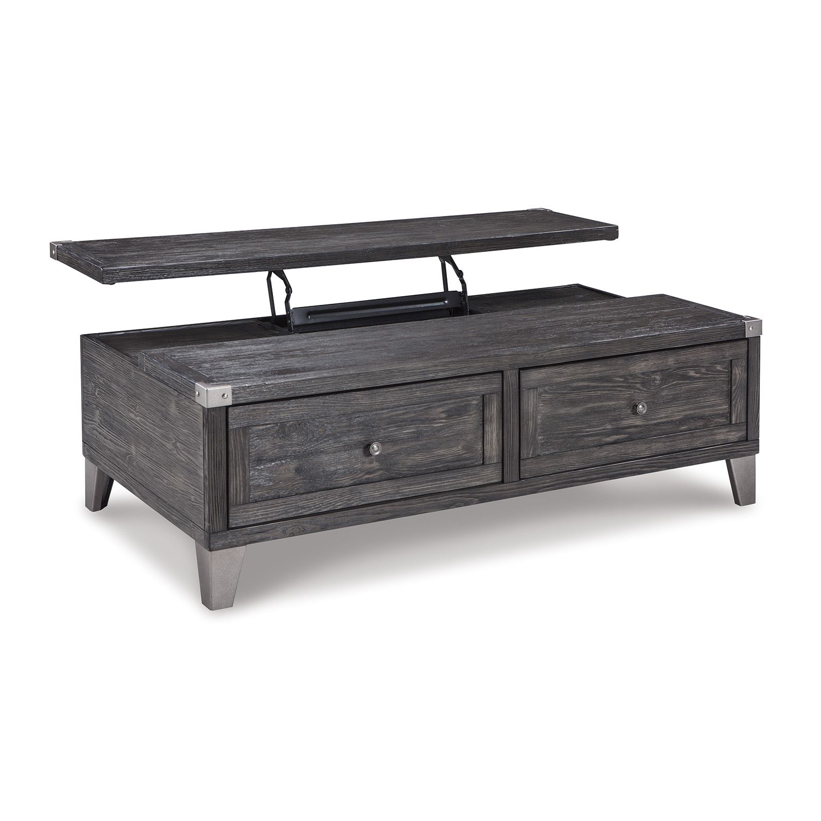 The Todoe Lift Top End Table blends rustic-industrial character with everyday convenience. In a weathered pine finish, it features canted metal legs and bracket accents for a bold, modern look. A smooth-gliding drawer keeps essentials close at hand, while two built-in electrical outlets and two USB charging ports on the back add smart functionality to this stylish accent piece.