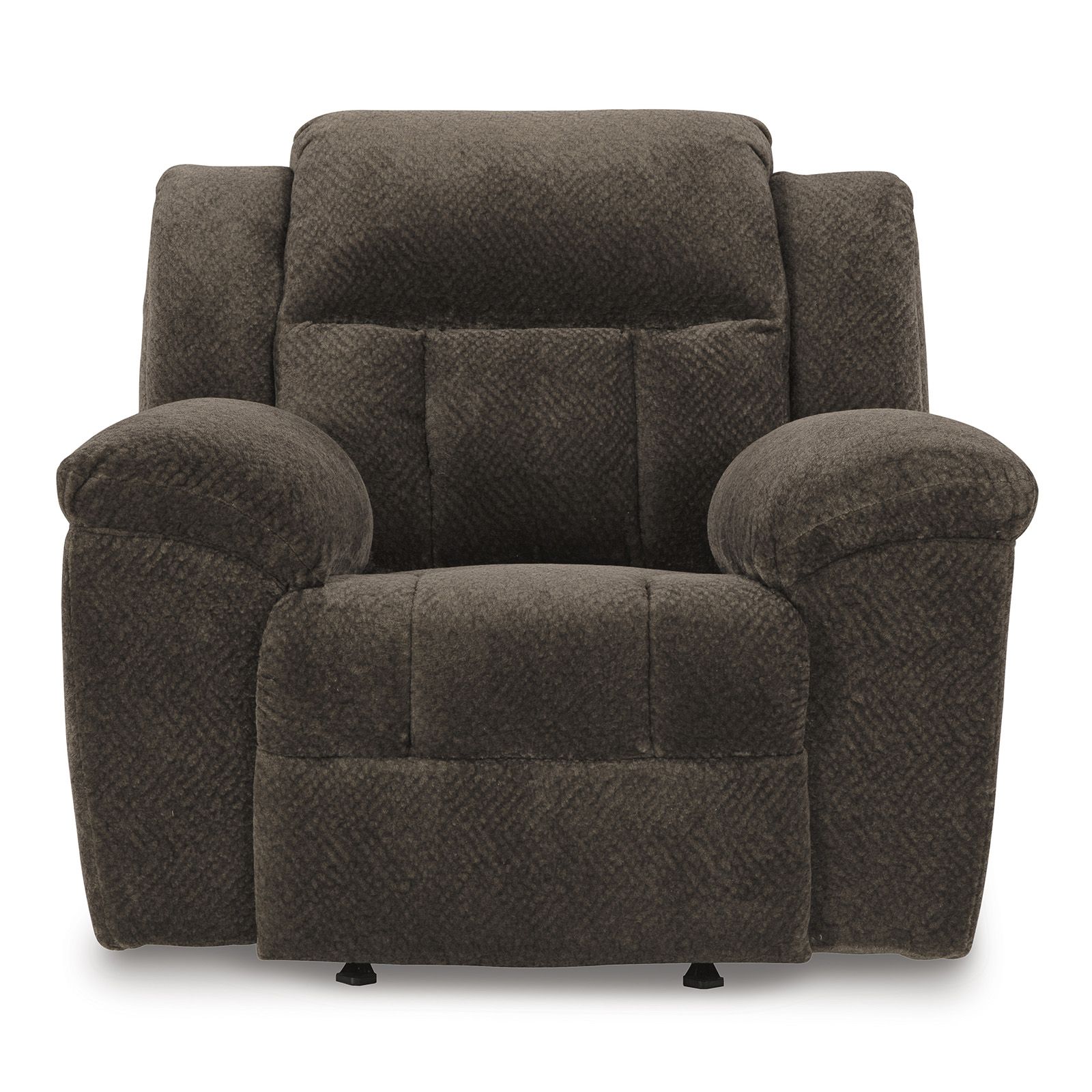 Settle into the Frohn Graphite Rocker Recliner, where extra-spacious comfort meets easygoing style. Wrapped in ultra-soft 100% polyester upholstery in a versatile gray hue, this large-scale recliner is designed for cozy solo lounging. Enjoy a smooth rocking motion or kick back with the pull tab reclining feature whenever it’s time to unwind. Built for lasting comfort with a corner-blocked frame, metal-reinforced seat, and high-quality foam cushions wrapped in poly fiber, it’s the perfect blend of durability and relaxation.
