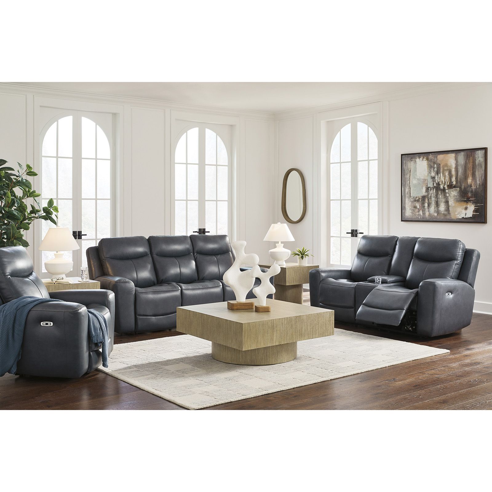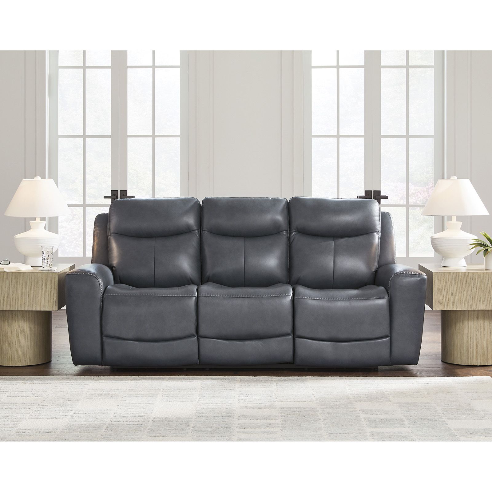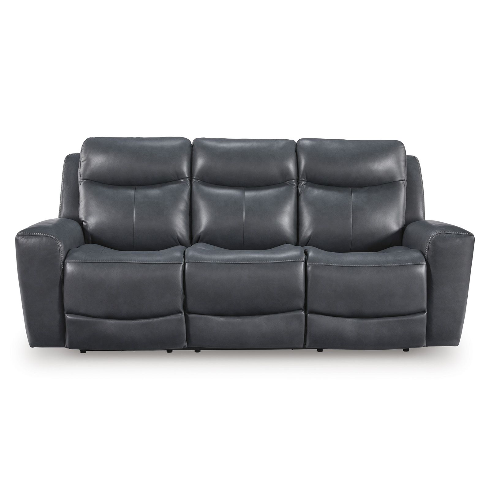 The Next Move Admiral Leather Power Recliner Console Loveseat pairs sleek modern style with easygoing comfort. Blue top grain leather covers the seating areas, with matching faux leather elsewhere, while cozy scooped seats and one-touch power controls offer infinite reclining and EasyView headrest adjustment. A center console with cupholders, hidden storage, and zero-draw USB-A and USB-C ports adds everyday convenience.
