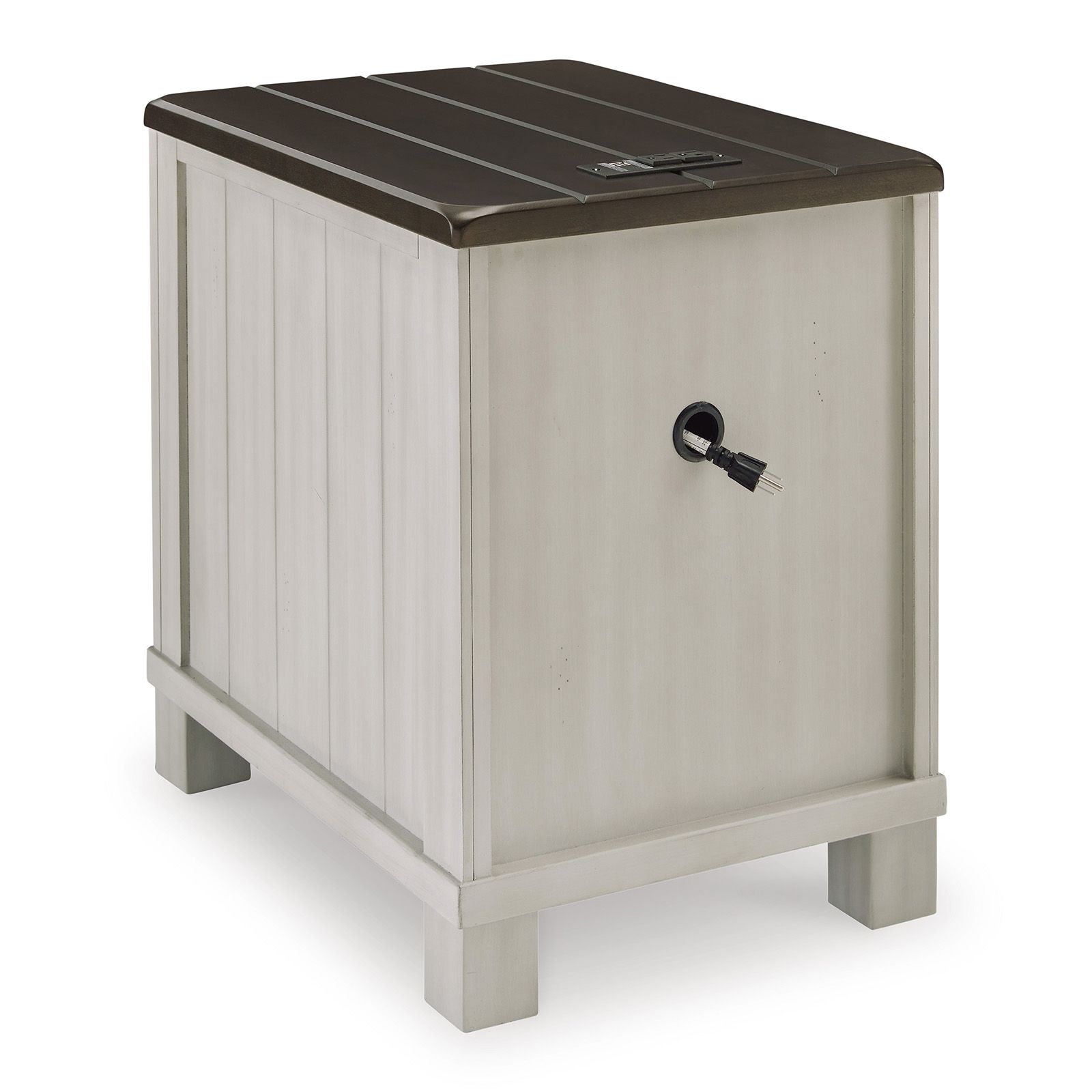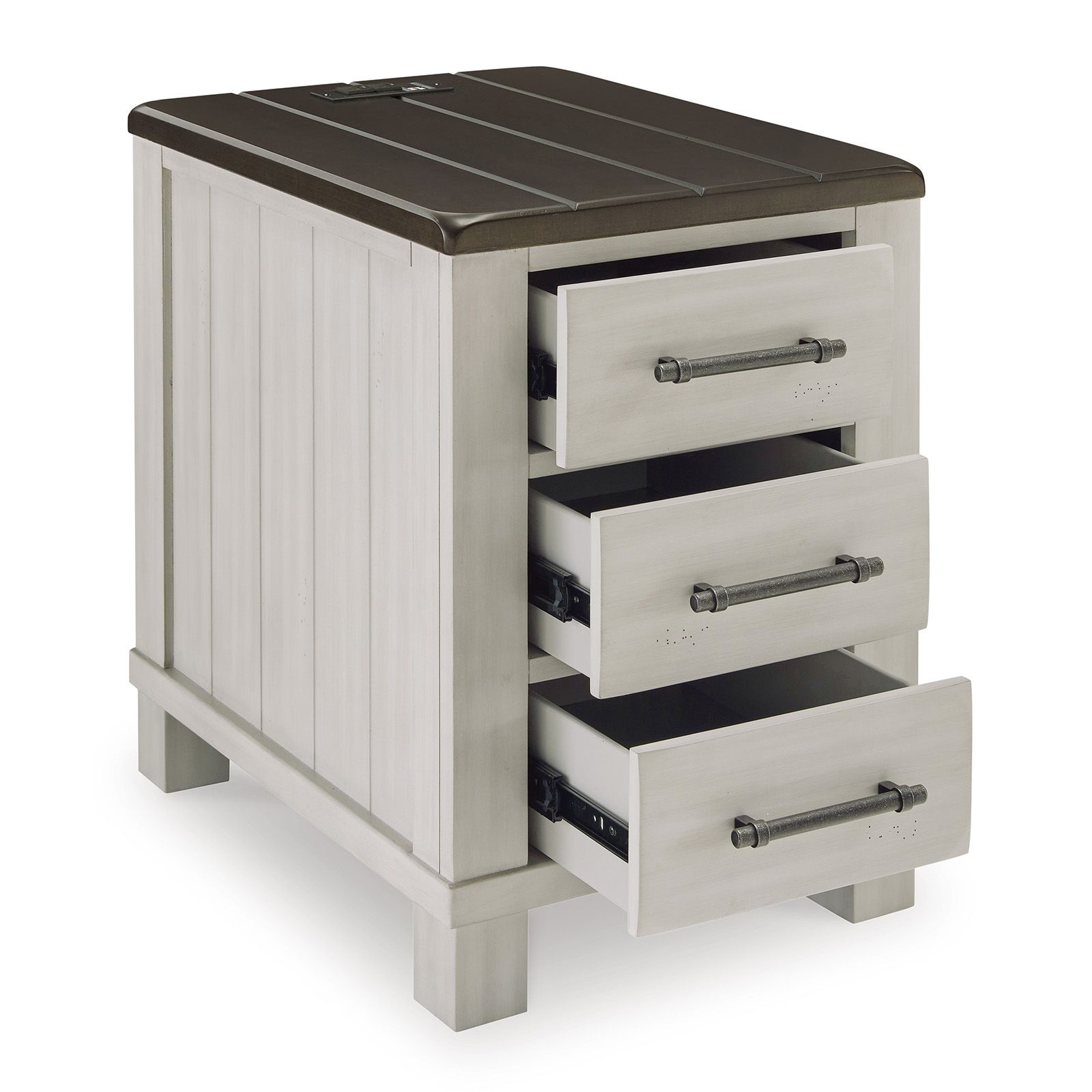 The Darborn Chairside End Table combines farmhouse charm with modern convenience. Featuring a planked brown cherry–stained top, light gray base, and subtle distressing, it offers three smooth-gliding drawers with aged iron-tone hardware for storage. Built-in dual USB charging ports keep your devices powered and close at hand.