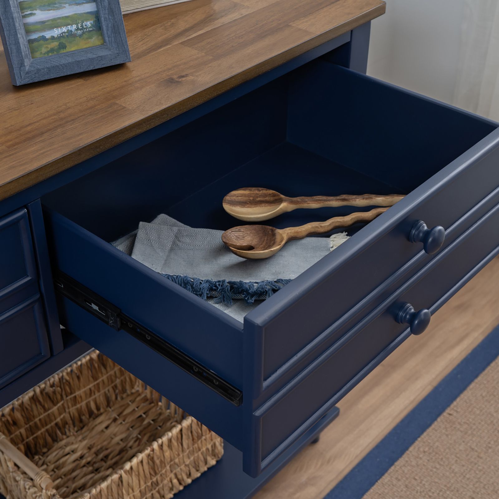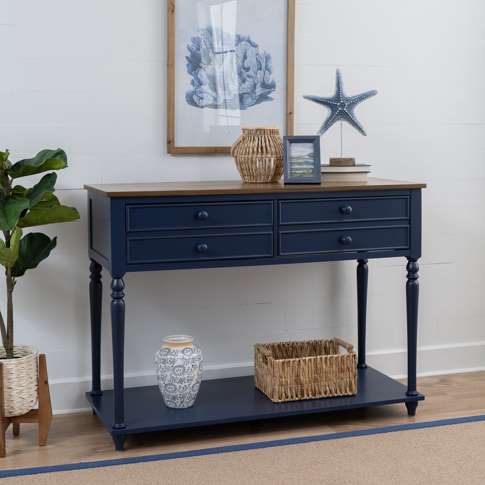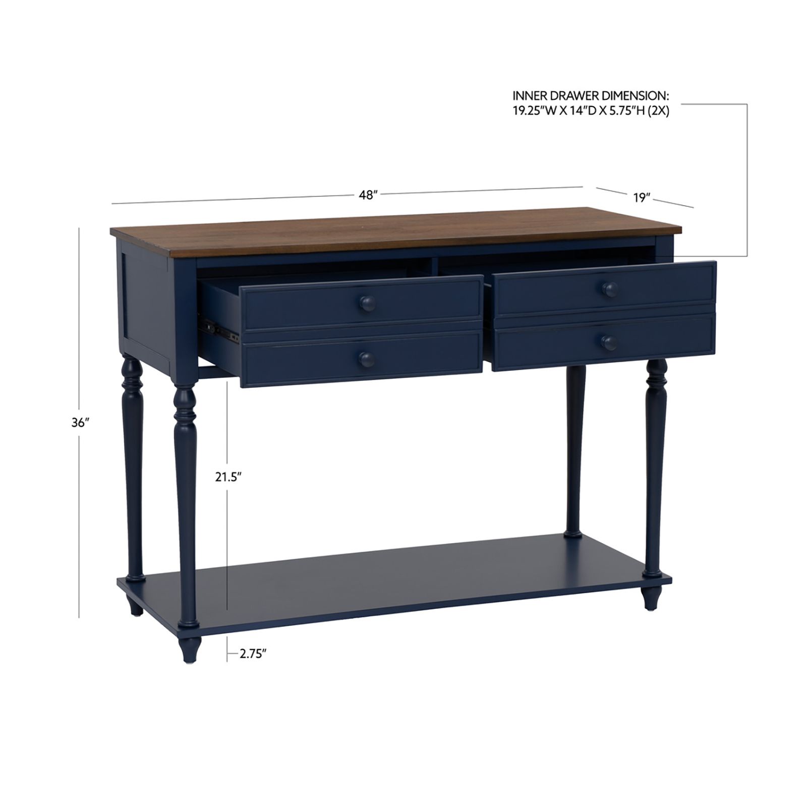 Bring bold style and warm contrast to your dining space with this eye-catching navy dining table. Featuring a smooth, rectangular brown wood top and richly painted navy legs, this piece blends traditional craftsmanship with contemporary flair. The turned legs add a classic touch, while the natural grain tabletop creates a welcoming, down-to-earth vibe. Designed to accommodate family meals, game nights, and casual gatherings, this table anchors your space with character and comfort. Pair it with matching chairs or a padded bench for a complete look that’s both stylish and practical.