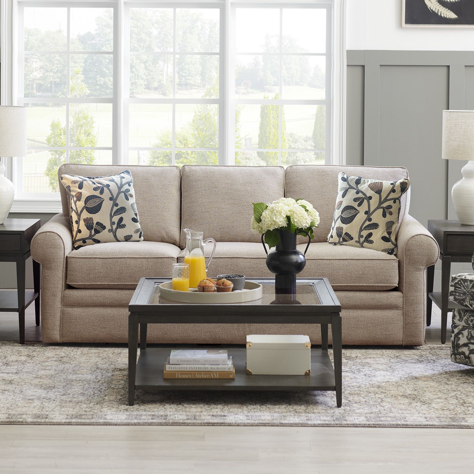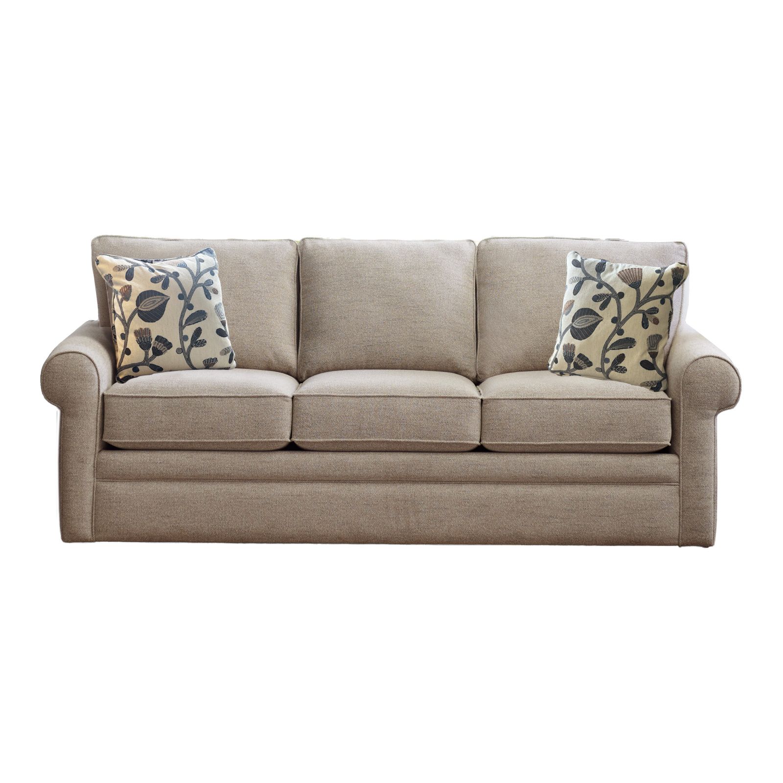 The Collins Twine Sofa offers timeless style with everyday comfort. Featuring over-scaled roll arms, welt-trimmed box cushions, and supportive semi-attached backs, its tailored design feels classic yet relaxed. Upholstered in a versatile light brown 100% polyester fabric, it’s built with high-grade foam cushions and double-picked blown fiber for lasting comfort and shape retention. Complete with two 20" accent pillows and a limited lifetime warranty, it’s proudly made in the U.S. with domestic and imported parts.