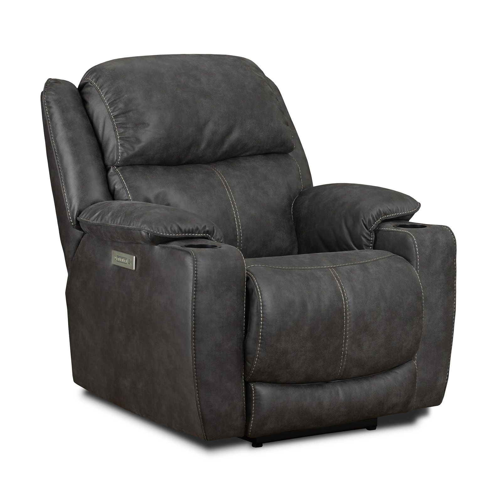 Enjoy home-theater comfort with the Arthur Steel Power Recliner, featuring easy-care 100% polyester upholstery in a stylish steel gray color. Designed with contemporary contrast stitching, plush pad-over chaise seating, and heavily padded arms, it offers personalized comfort with a zero-gravity lay-flat mechanism, power-adjustable headrest, and lumbar support. Built-in cupholders add convenience, and it’s proudly built in the U.S.A. for lasting quality.