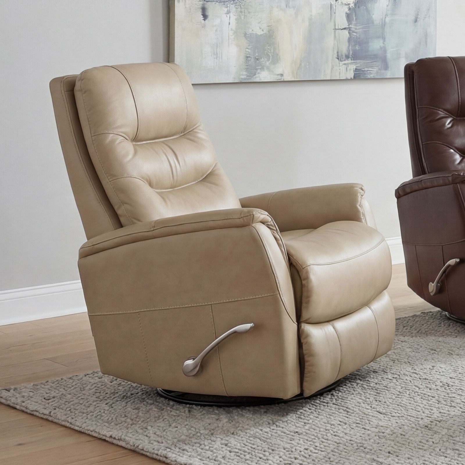 The Revelation Mushroom Leather Match Swivel Glider combines modern style and everyday comfort in a medium-scale design. Upholstered in mushroom beige top-grain leather everywhere you touch, it features clean lines, a solid foam track arm, and a pad-over chaise for added leg support. The smooth gliding motion, full 360-degree swivel base, and polished aluminum handle create a sleek, functional recliner proudly built in the U.S.A.