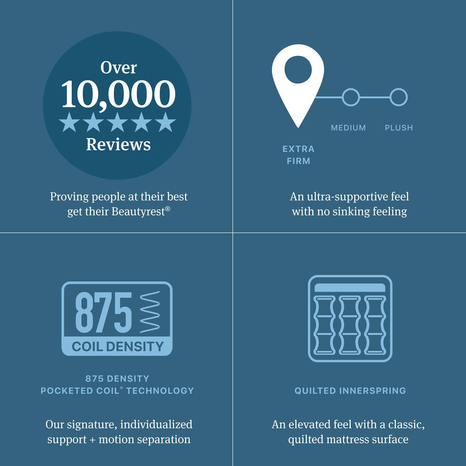 The Beautyrest Extra Firm Twin Mattress is built for those who crave firm, reliable support without sacrificing comfort. Its 875 Density Pocketed Coil Technology delivers signature individualized support and exceptional motion separation, ensuring a restful sleep in any position. The quilted SurfaceTouch™ Gel Memory Foam and Beautyrest® ActiveResponse™ Memory Foam provide targeted pressure relief and contouring comfort to ease aches and pains. Stay cool throughout the night with InfiniCool™ Technology, which draws heat away from your body for a refreshing sleep surface. With a 13.25" profile, this mattress fits deep pocket sheets, is adjustable base compatible, CertiPUR-US® certified, and proudly assembled in the USA—backed by a 10-year limited warranty.