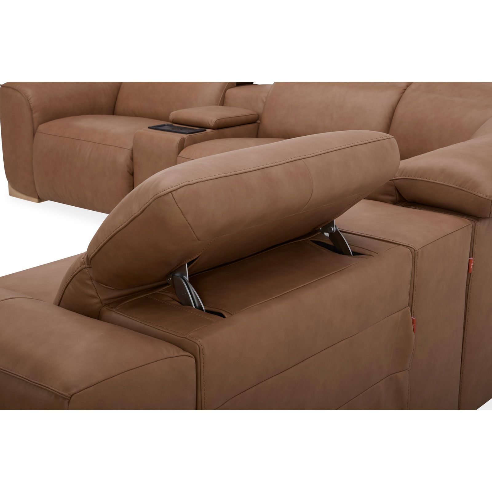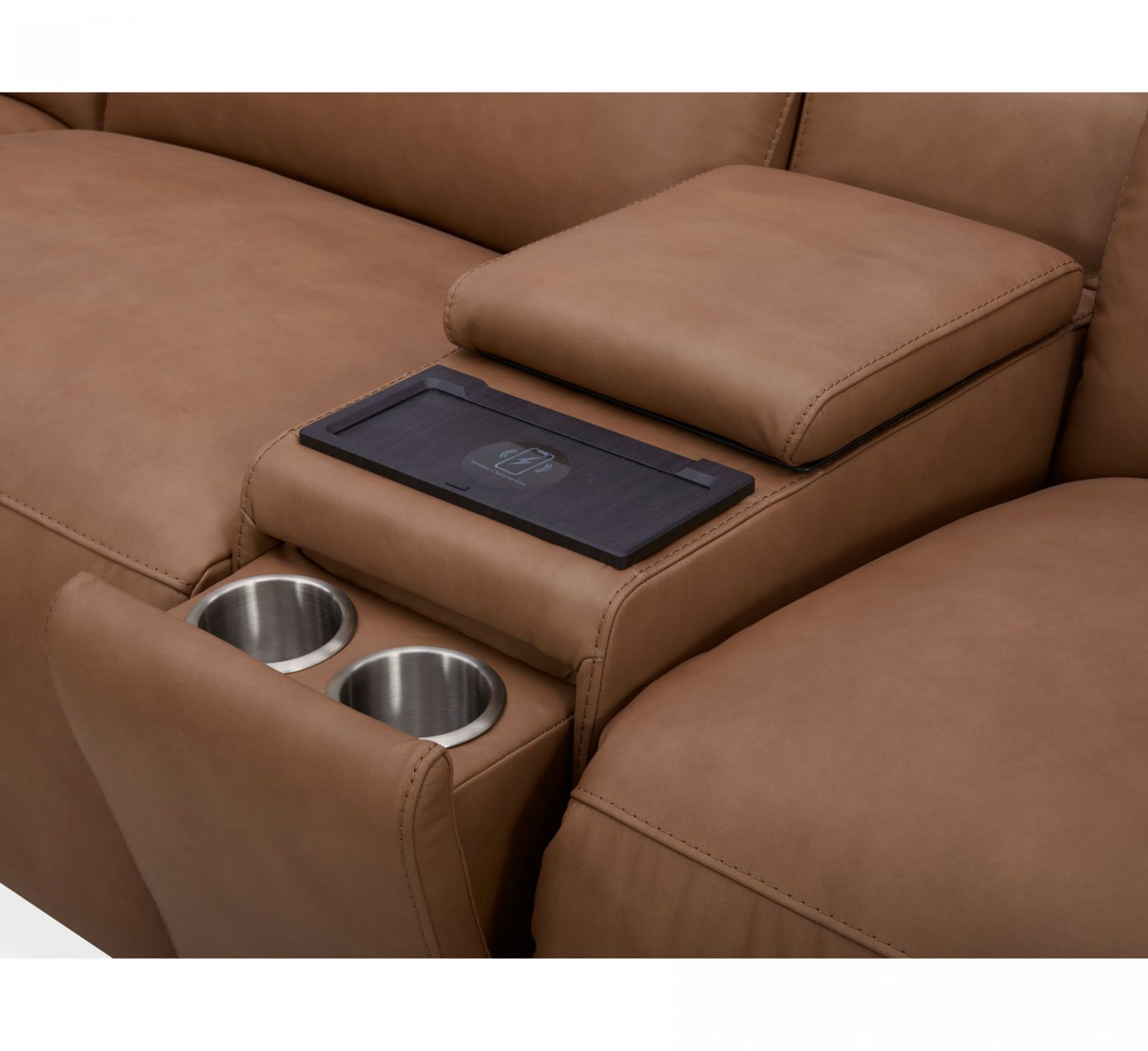 The Butternut 6-Piece Power Reclining Sectional offers luxurious comfort and modern functionality. Upholstered in top grain leather with matched vinyl on the sides and back, this sectional features a rich butternut brown color complemented by natural wood-finished plinth legs. The set includes three power recliners, an armless chair, a corner wedge, and a console with hidden cupholders that emerge at the touch of a button. Feather and fiber-filled power footrests and adjustable headrests provide personalized comfort, while the console adds convenience with wireless charging, USB charging, and a charging station. Sturdy construction and sinuous spring suspension ensure lasting support.