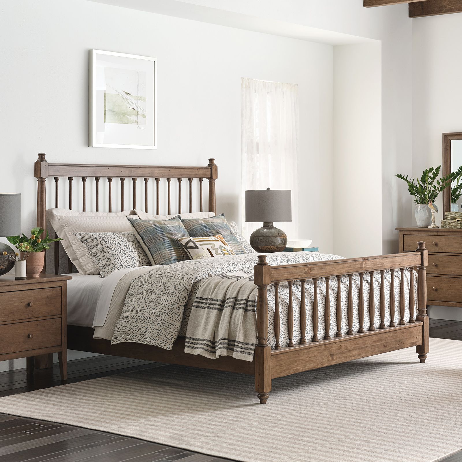 Add timeless charm to your space with the Arbor Bark 3-Piece King Bedroom Group. Crafted from 100% solid pine wood in a warm bark finish, this set includes a king spindle bed with turned feet and mortise and tenon construction, a six-drawer dresser with whisper-quiet glides and a removable jewelry tray, and a beveled glass mirror. Thoughtful details like dovetail drawers and your choice of bark wood or black nickel hardware complete this beautifully built Arbor Collection set.