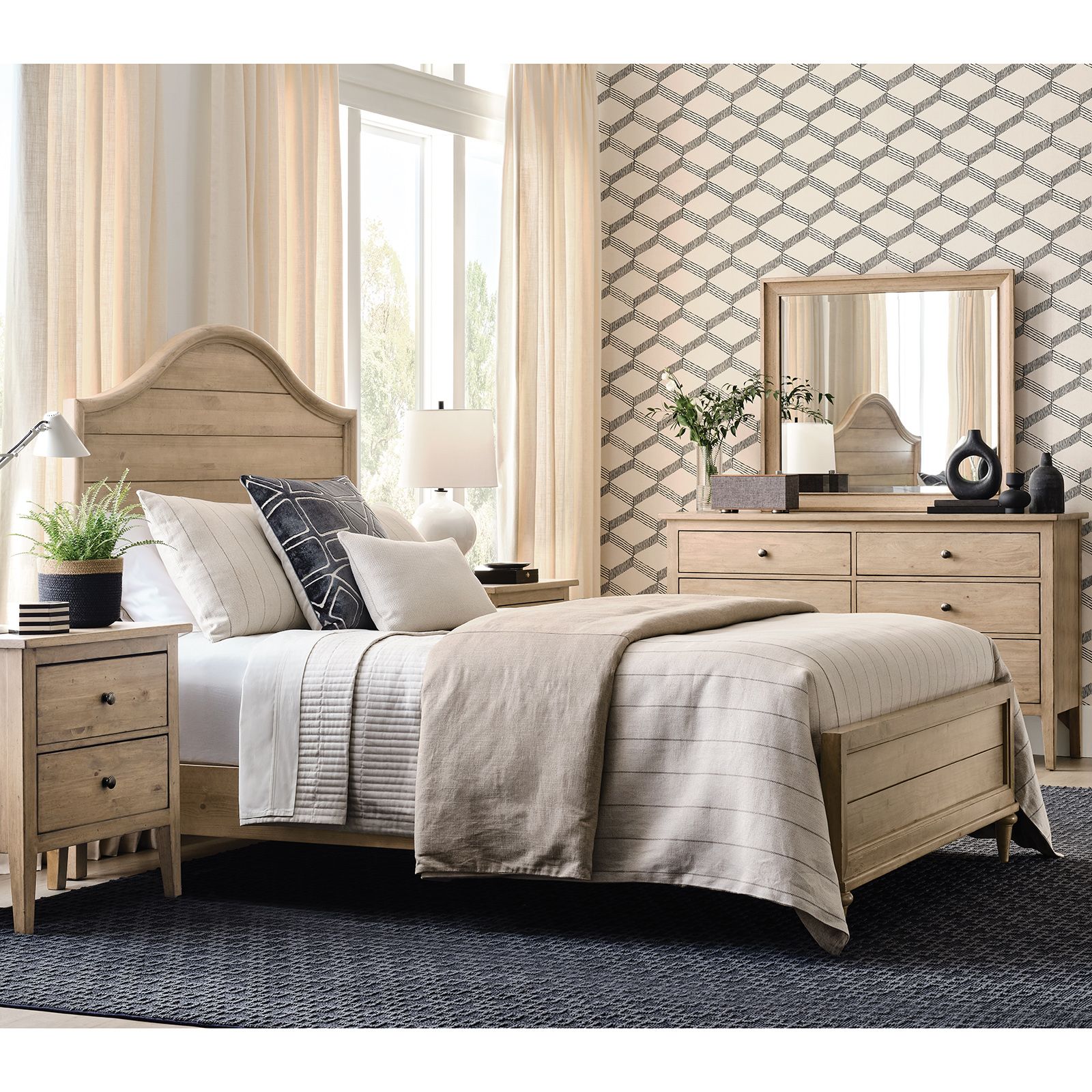 The Arbor Oatmeal 3-Piece Queen Bedroom Group brings classic style and thoughtful craftsmanship to your bedroom. Made from 100% solid pine in a soft Oatmeal finish, the set includes a queen panel bed with tapered feet, a six-drawer dresser with dovetail drawers, whisper-quiet glides, and a removable jewelry tray, plus a coordinating mirror. Mortise and tenon construction ensures lasting durability, and it ships with both wood and black nickel hardware for a polished look, all part of the timeless Arbor Collection.