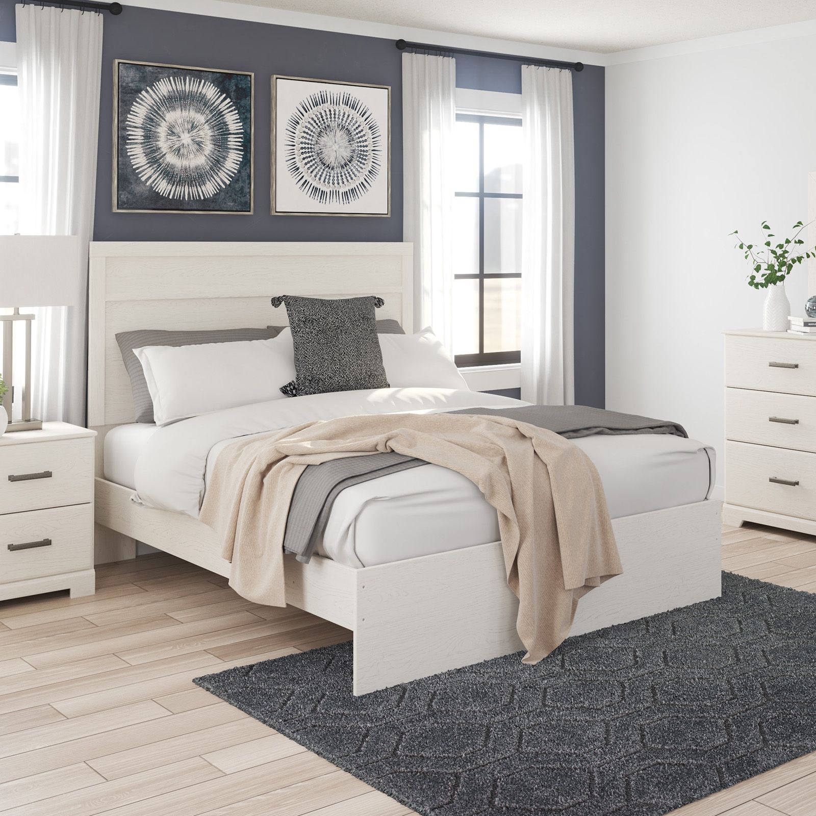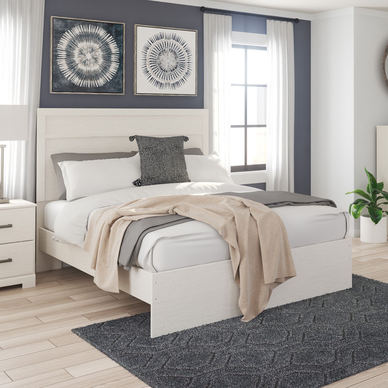 The Stelsie White Full Panel Bed brings a fresh, modern attitude to your bedroom with its clean-lined design and crisp white finish. Crafted from engineered wood with a subtle replicated grain, it offers both durability and style. The simple profile is elevated by plank-style moulding on the headboard, adding depth and dimension while keeping the look sleek and contemporary. Complete with headboard, footboard, and rails, this bed is proof that beauty truly lies in the details.
