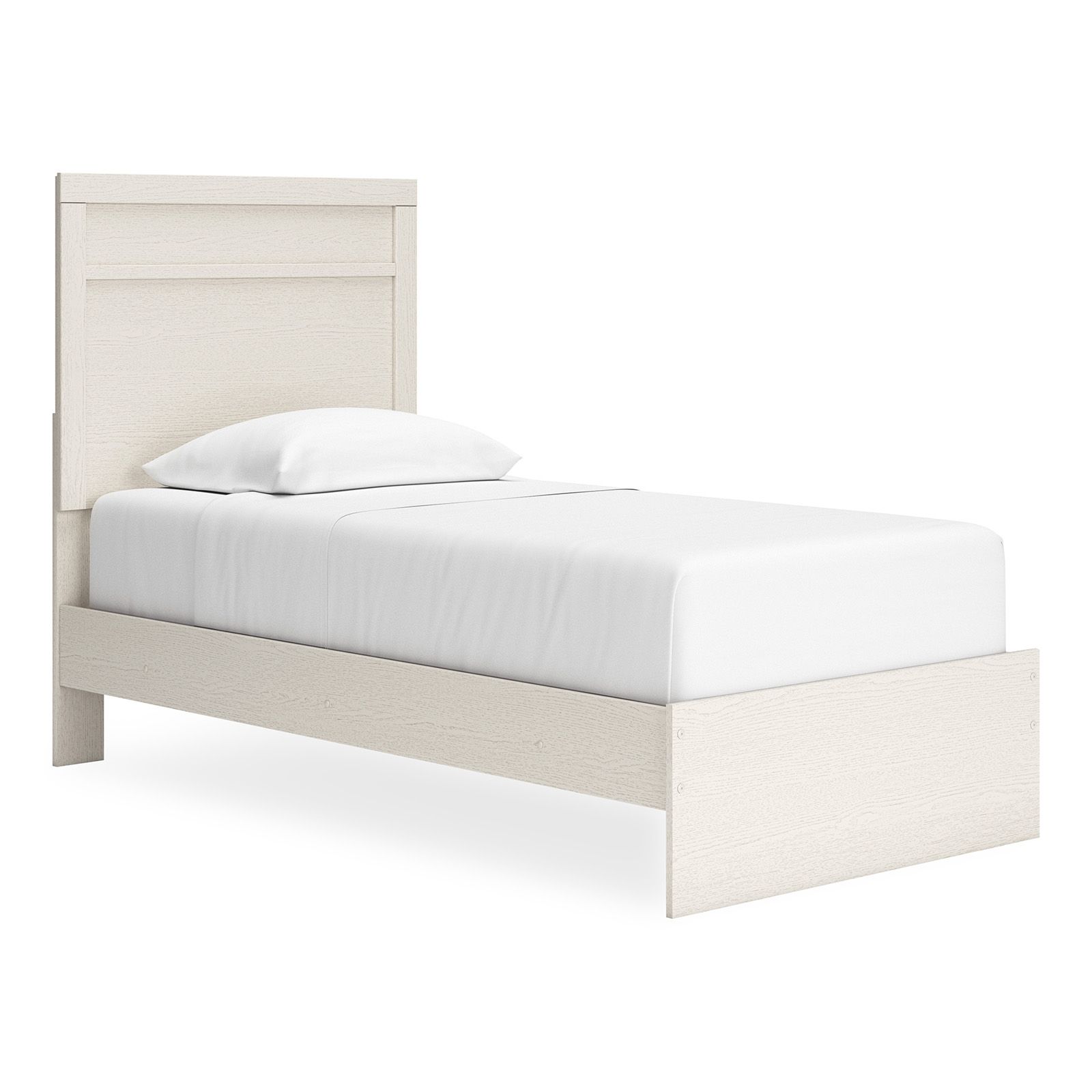 The Stelsie White Full Panel Bed brings a fresh, modern attitude to your bedroom with its clean-lined design and crisp white finish. Crafted from engineered wood with a subtle replicated grain, it offers both durability and style. The simple profile is elevated by plank-style moulding on the headboard, adding depth and dimension while keeping the look sleek and contemporary. Complete with headboard, footboard, and rails, this bed is proof that beauty truly lies in the details.