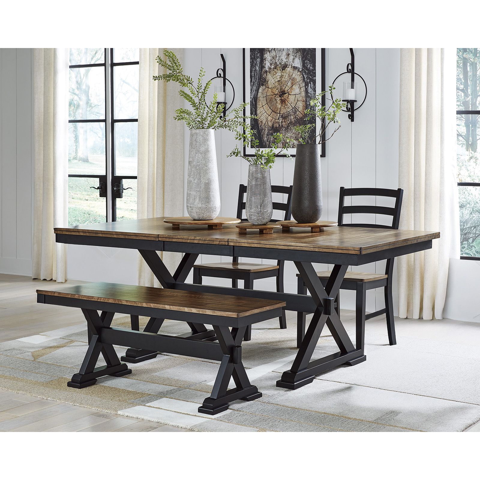 Raise the bar on modern farmhouse style with the Wildenauer Dining Table. This table showcases a striking two-tone finish with a warm satin black frame and a rich butcher block mango veneer top in a deep brown wood tone. Its sturdy silhouette brings a hearty, timeless feel to any space, while the self-storing 18" butterfly leaf extends the table to comfortably seat up to eight. Perfect for both everyday meals and special gatherings, this table serves up charm and functionality in equal measure.