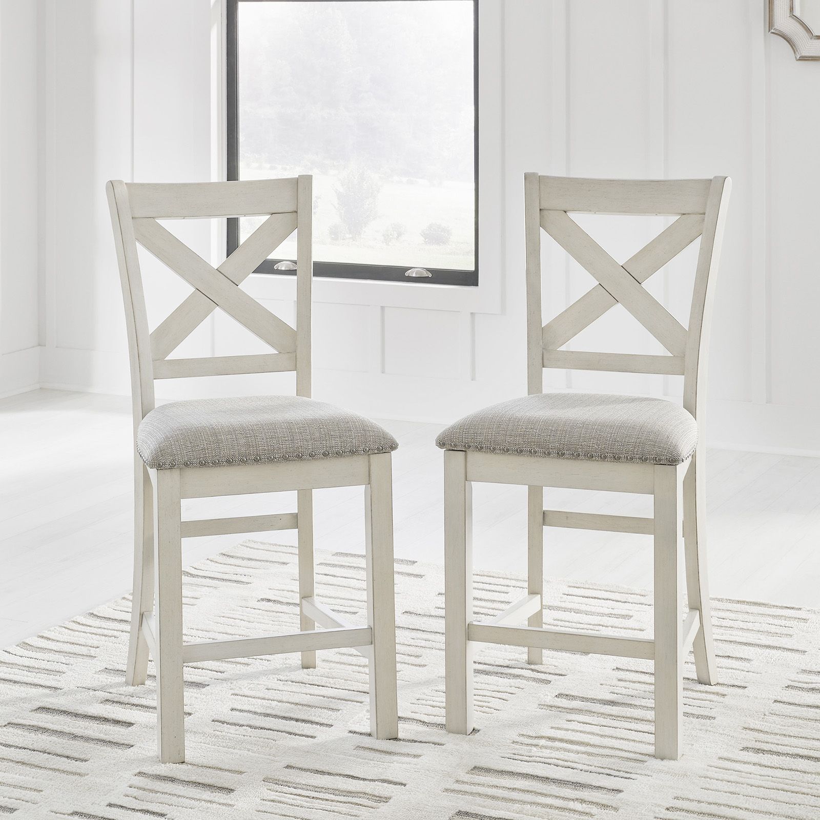 The Robbinsdale Upholstered Barstool brings timeless farmhouse charm to your dining space. Crafted in an antiqued white finish with a subtle wood grain texture, it exudes rustic elegance. The light gray polyester upholstery with a plush foam cushion ensures comfort, while the nailhead trim and X-style back add a refined, handcrafted touch. Perfectly scaled for counter height dining, this stool combines comfort, style, and everyday durability for a welcoming seat at every meal.