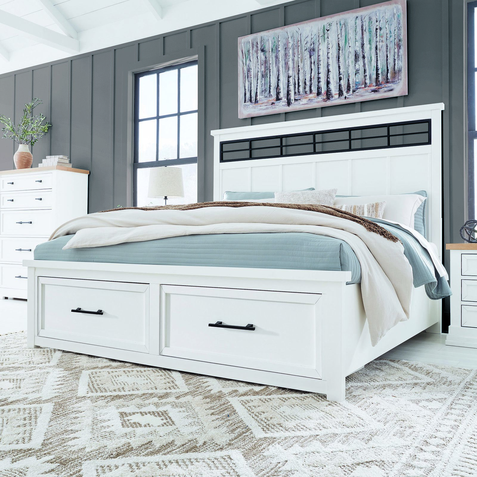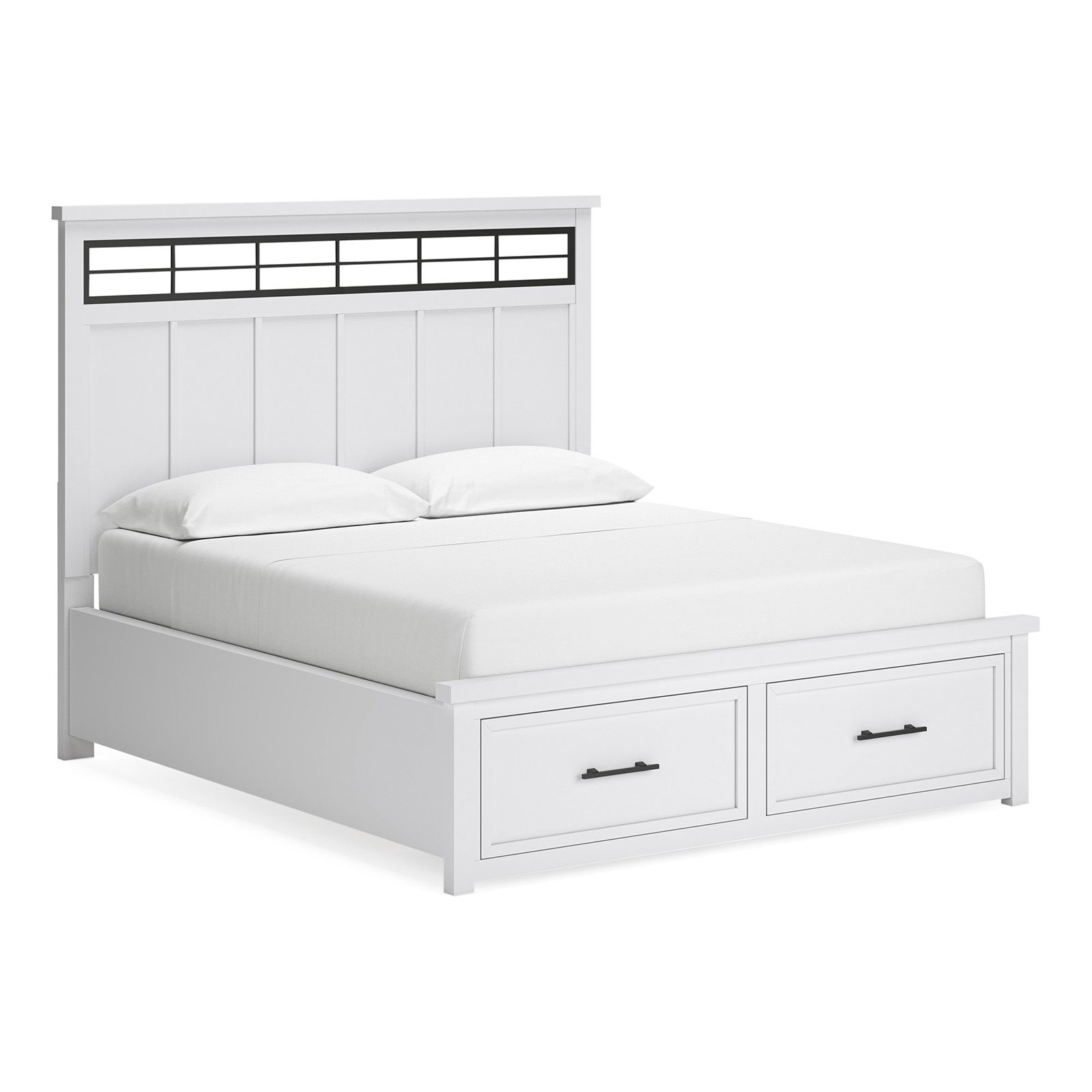 The Ashbryn Queen Storage Bed combines modern farmhouse style with smart storage. Its white hardwood frame features a black metal inset headboard, while two spacious footboard drawers with dovetail construction and ball-bearing glides keep essentials organized. Rails and slats are included—no box spring needed—for a cozy, functional centerpiece.