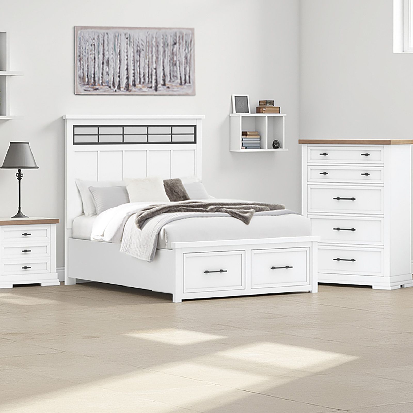 The Ashbryn 3-Piece Queen Bedroom Group brings casual modern farmhouse style and smart storage to your sanctuary. Featuring a queen storage bed with black metal inset headboard and footboard drawers, a two-tone dresser with 10 spacious drawers, and a coordinating mirror, this set blends white and natural wood finishes with matte black accents. Built from hardwood solids and veneers with durable dovetail construction and smooth ball-bearing glides, it keeps your essentials organized while creating a cozy, polished look—no box spring required.
