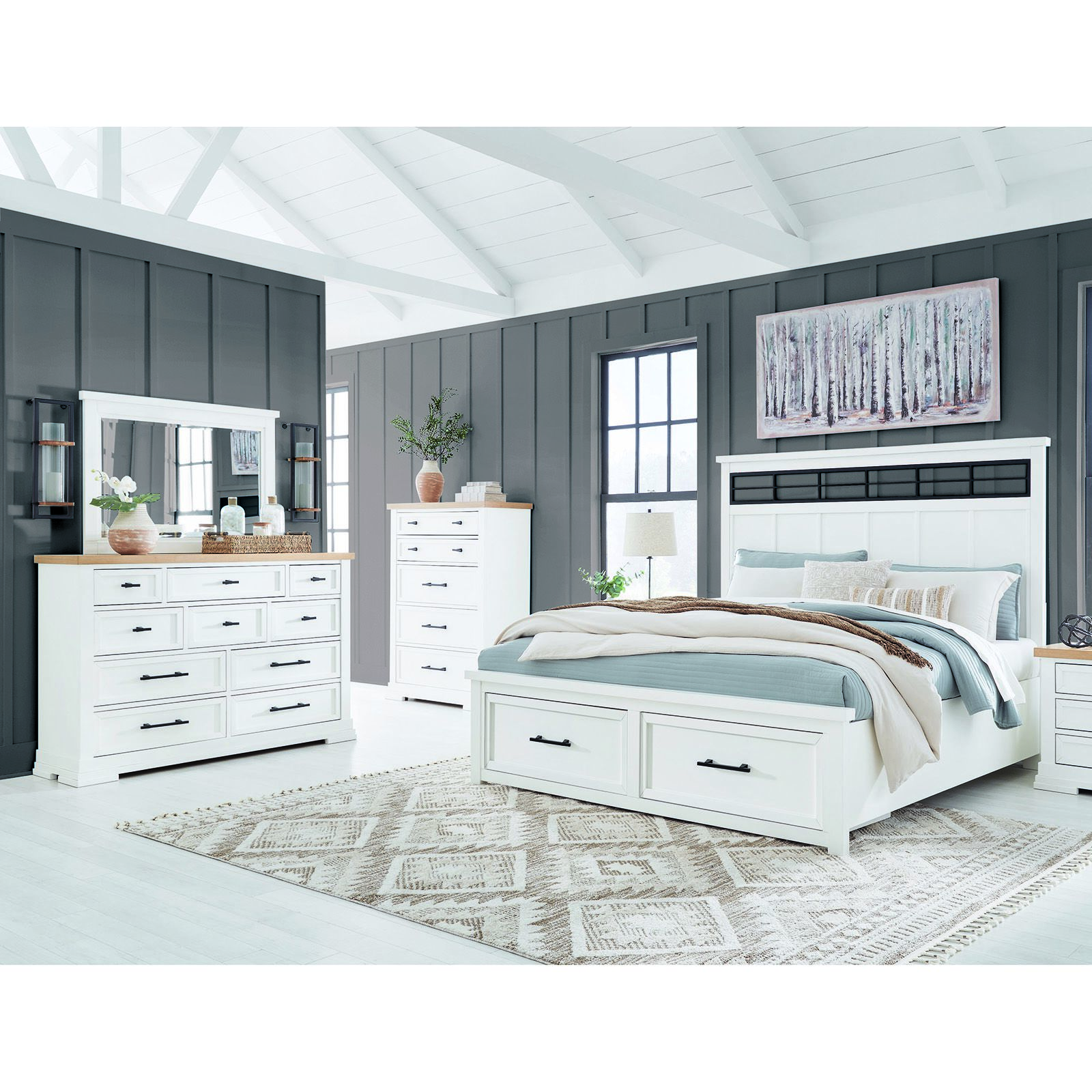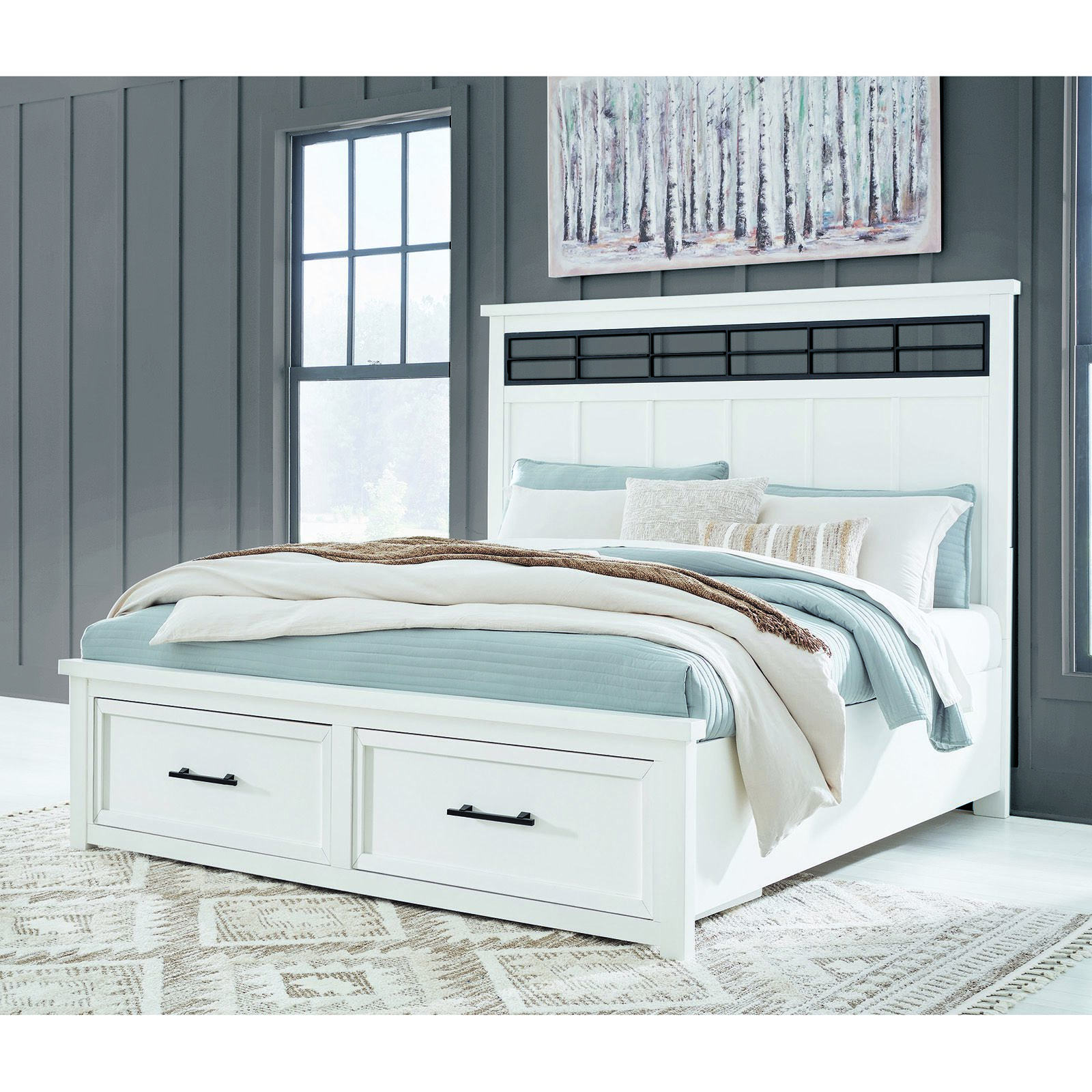 The Ashbryn King Storage Bed combines modern farmhouse style with smart storage. Its white hardwood frame features a black metal inset headboard, while two spacious footboard drawers with dovetail construction and ball-bearing glides keep essentials organized. Rails and slats are included—no box spring needed—for a cozy, functional centerpiece.