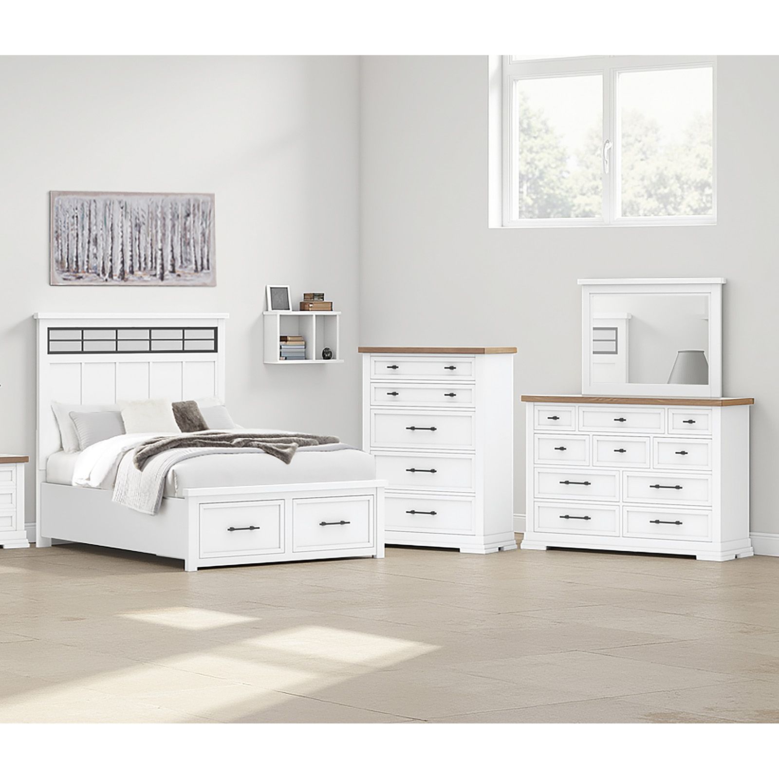 The Ashbryn Queen Storage Bed combines modern farmhouse style with smart storage. Its white hardwood frame features a black metal inset headboard, while two spacious footboard drawers with dovetail construction and ball-bearing glides keep essentials organized. Rails and slats are included—no box spring needed—for a cozy, functional centerpiece.