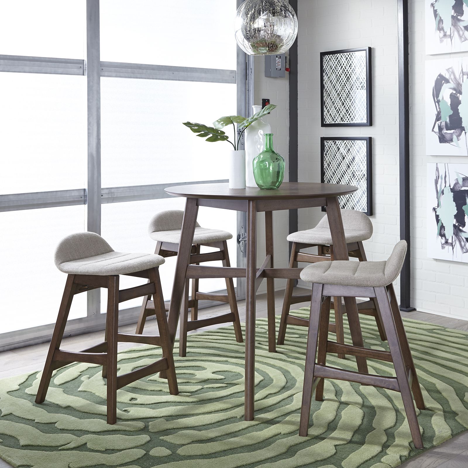 Do not sacrifice style while saving space with the Space Savers five-piece gathering table set. Crafted of rubberwood solids and walnut veneers, this set features a satin walnut finish and consists of the gathering table and four counter height chairs with gray upholstery. The gathering table has a fixed round top that is anchored by splayed legs with a softly rounded edge and an X style center stretcher. The Space Savers collection allows for contemporary, trendy looks in today’s casual finishes.