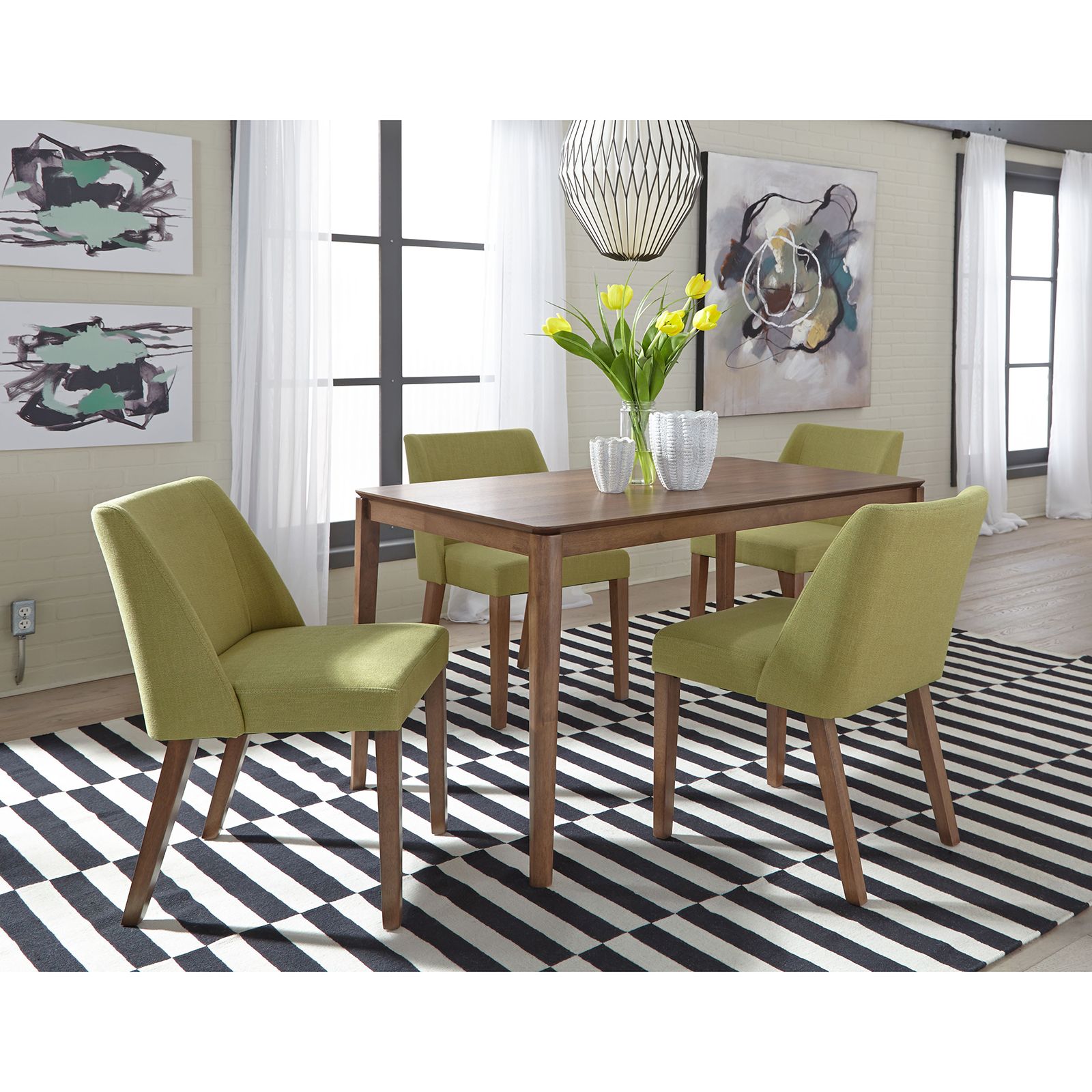 Bring effortless style and smart functionality to your dining space with the Space Savers Nido Green 5-Piece Dining Set. Crafted from hardwood solids and veneers in a warm Satin Walnut finish, this soft contemporary set features a fixed round table with gently rounded edges and sleek tapered legs for a clean, inviting look. Four comfortable side chairs showcase gray upholstery and tapered block feet in a rich Kaffe finish, creating a perfect blend of casual charm and modern design ideal for everyday dining.