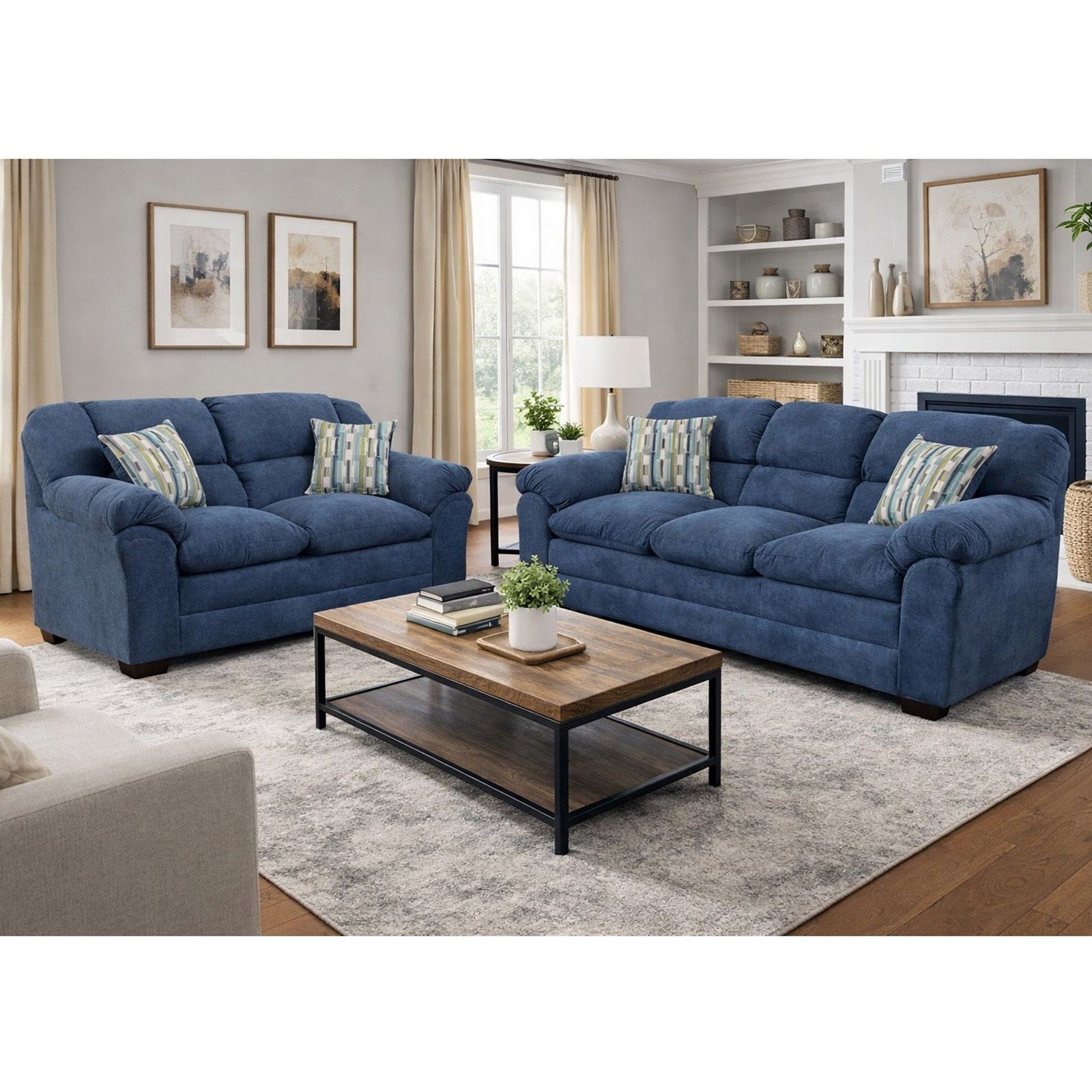 The Venus Indigo Sofa & Loveseat Combo Set offers cozy comfort and classic style in smooth indigo microfiber. Featuring plush seating, rolled arms, and two accent pillows per piece, it’s a warm, inviting addition to any living space.